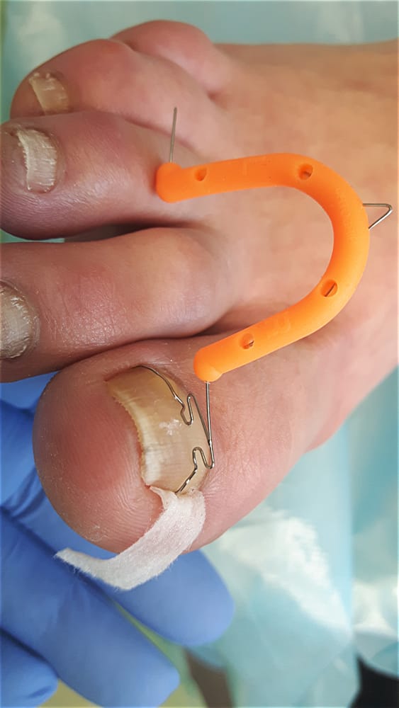 Bevor sich der Nagel entzündet (oder sogar eitert), sollte der Patient zum Arzt gehen und sich eine Überweisung für eine Nagelspange (Orthomyxie) für Podologen geben lassen (Rezeptmuster 16). Die Krankenkassen übernehmen einen Teil der Kosten.
